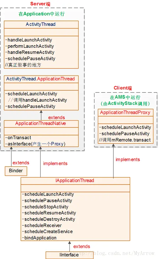 ApplicationThread,用来实现ActivityManagerService与ActivityThread之间的交互。在ActivityManagerService需要管理相关Application中的Activity的生命周期时,通过ApplicationThread的代理对象与ActivityThread通讯。