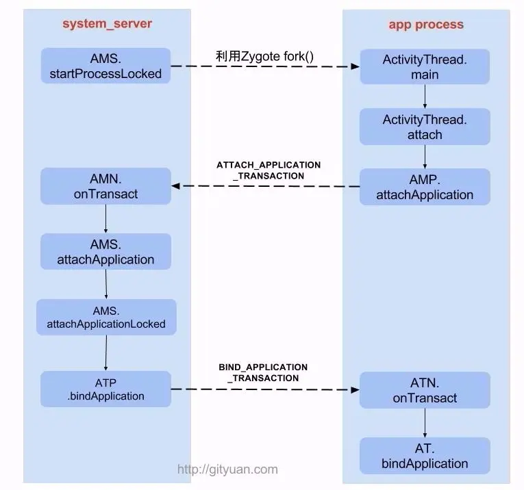App进程,通过Binder IPC向sytem_server进程发起attachApplication请求;