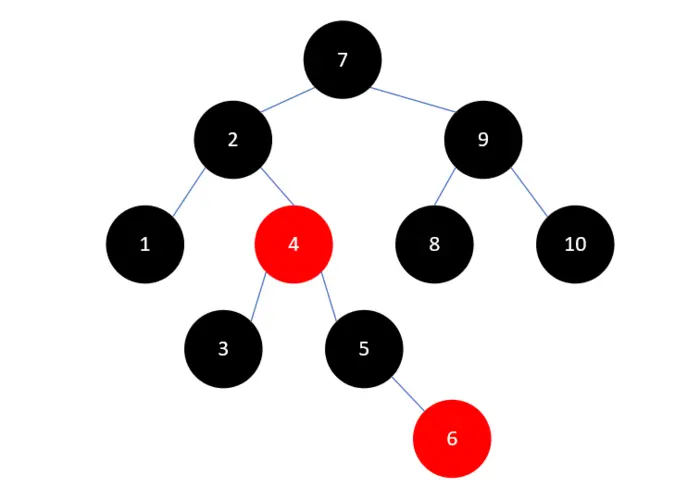 这时,我们的关注点从叔叔结点转到兄弟结点,也就是结点4,此时4是红色的,就把它染为黑色,把父结点2染为红色,如下所示:
