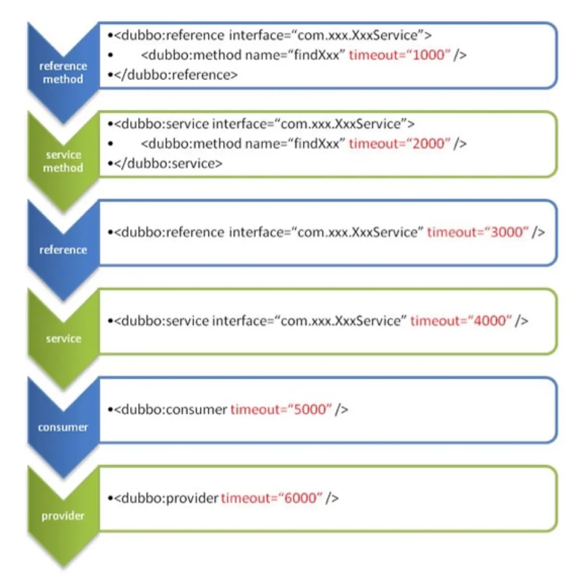 看代码+debug之前,先明确一个概念,dubbo虽然建议provider配置超时时间,但是provider如果同时和consumer配置timeout,那么会使用consumer配置的,这里我从文档上扣一张图过来说明一下timeout的配置优先级: