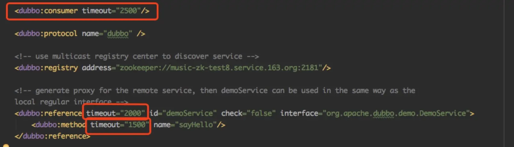 <dubbo:service timeout="2500" interface="org.apache.dubbo.demo.DemoService" ref="demoService"/>