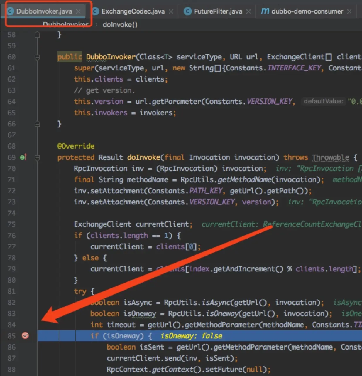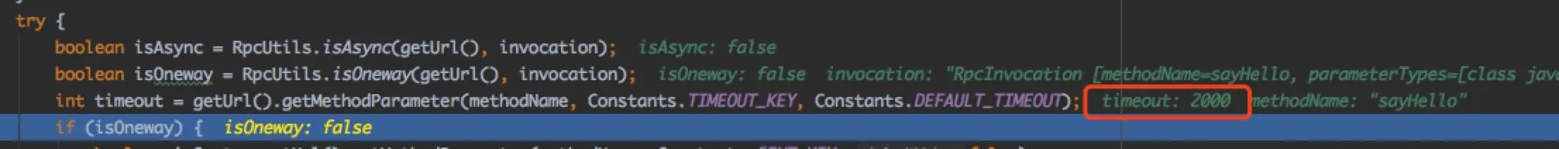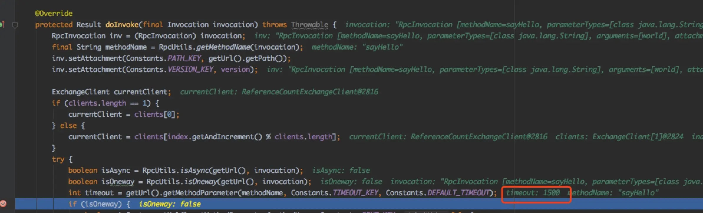 如果按照图上的顺序,应该使用1500这个配置项。我们看下实际效果,这里我用的dubbo协议,一次rpc调用会走到DubboInvoker#doInvoke里,也就是这里设置了超时。