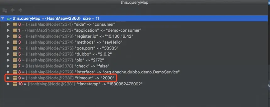 这里这个queryMap,是:this.queryMap = StringUtils.parseQueryString(url.getParameterAndDecoded(Constants.REFER_KEY));获取的,里面包含了一些本地设置的属性,比如timeout,我举个栗子,C的配置:<dubbo:reference timeout="2000" id="demoService" check="false" interface="org.apache.dubbo.demo.DemoService"/>的时候,queryMap的内容: