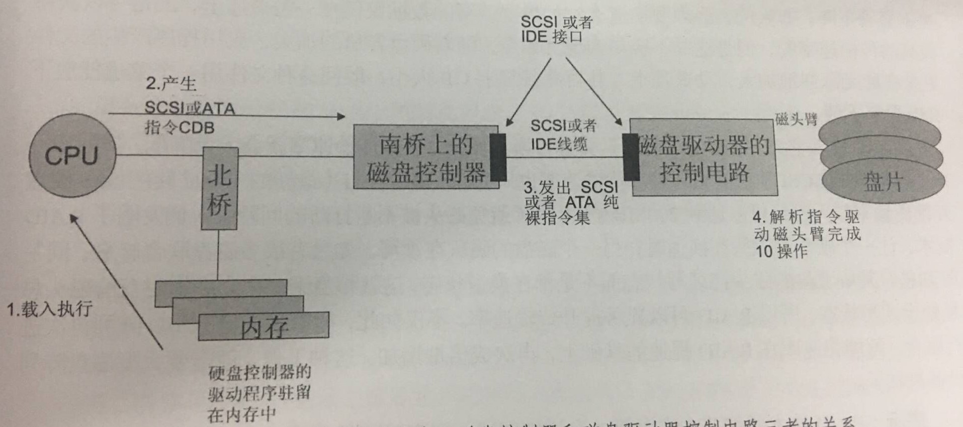 磁盘的接口包括物理接口,就是磁盘要接入磁盘控制器所需要的接口,除了物理接口规范外,还定义一套指令系统,指令集定义怎么向磁盘发送数据和读取数据以及控制其他行为,比如SCSI和ATA指令。指令的内容是由运行在操作系统内核的驱动程序生产,而物理的连接则是磁盘控制器负责的,磁盘控制器负责底层总线初始化,仲裁等过程以及指令传输过程,指令传输状态机,重传,ack确认等,将这些太过底层的机制过滤后,向驱动程序提供一个简洁的接口。