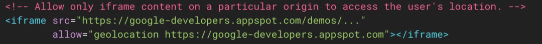 这里设置的策略可以使得 iframe 只有在 "https://google-developers.appspot.com/" 下才能使用 Geolocation API。