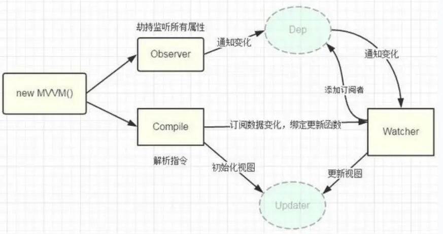 Compile指令解析器器,它的作⽤对每个元素节点的指令进⾏解析,替换模板数据,并绑定对应的更新函数,初始化相应的订阅。