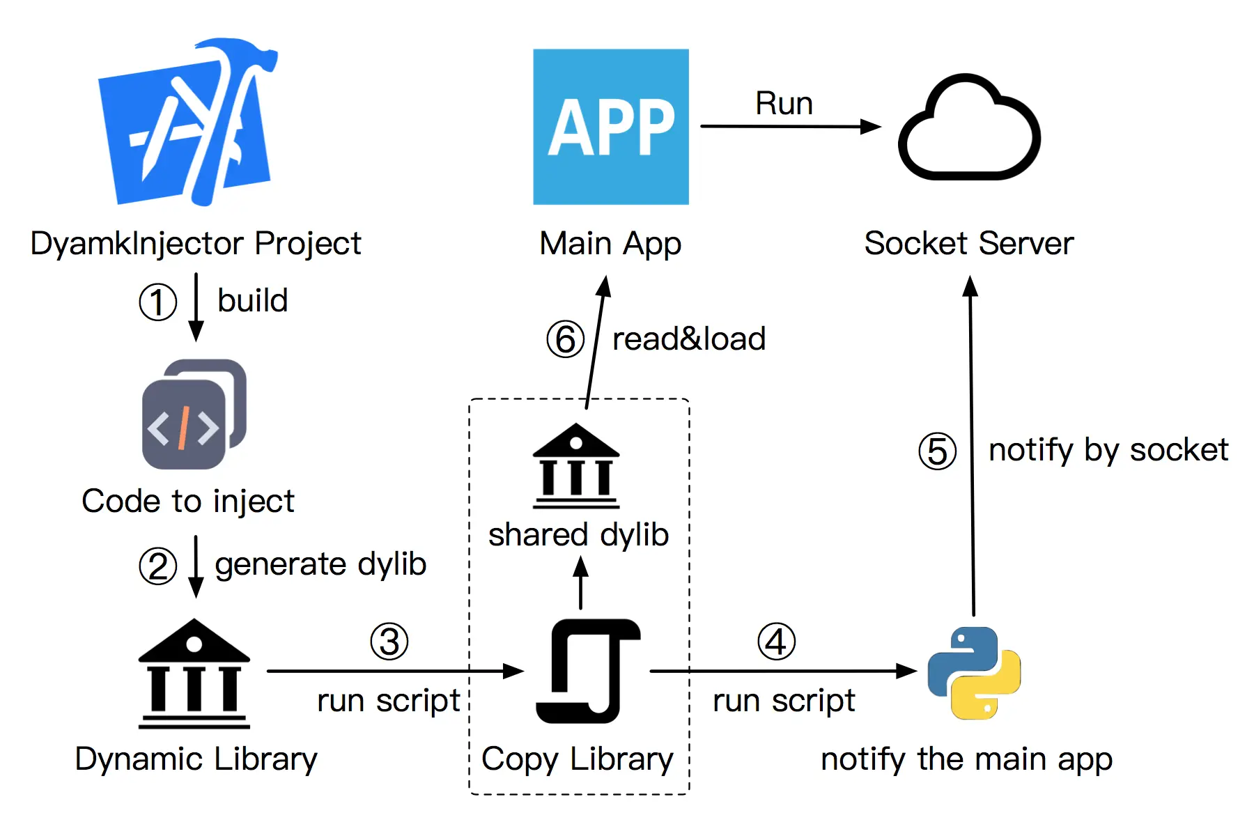 上图是Dyamk的架构和工作流程图,Dyamk主要包括两个部分,一个是用于创建和分发动态库的DyamkInjector