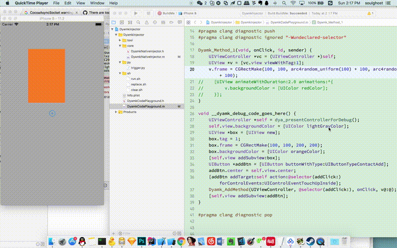 是一个iOS动态库工程,当动态库完成编译后,会运行一系列脚本,将动态库签名、移动到共享目录、通过Socket通知DyamkClient