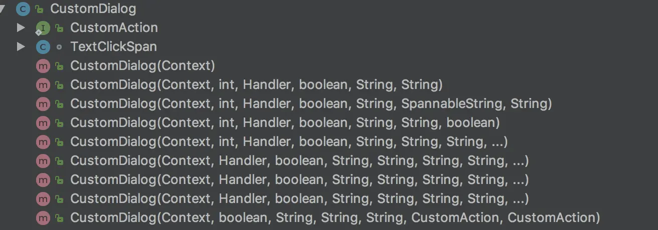 导致每一次增加一种类型的 Dialog 就要增加一个构造函数来实现,久而久之这个类属性也越来越多,构造参数的种类也越来越多,这个类的初衷是为了封装系统AlterDialog的使用,让一些相同样式的Dialog可以用最简单的样式创建,无奈UI样式随着产品的迭代,越来越多,这种单纯的封装有点让人力不从心了。