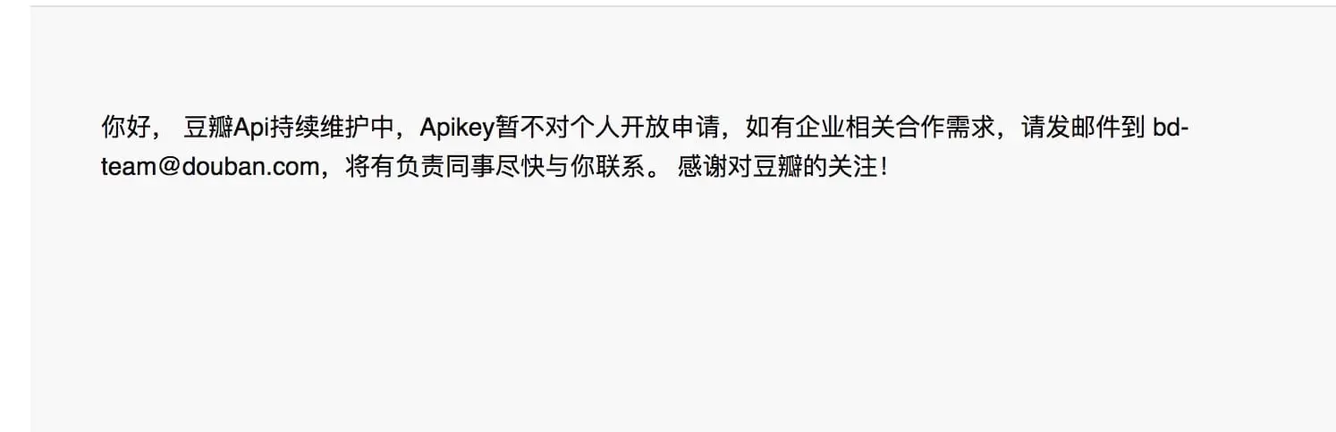 通过搜索引擎,我找到了豆瓣开发者平台,在豆瓣电影的文档中有获取电影,获取影评等等的详细接口,正当我以为接下来的数据采集将会变得非常简单之时,下面这张图还是让我冷静了下来