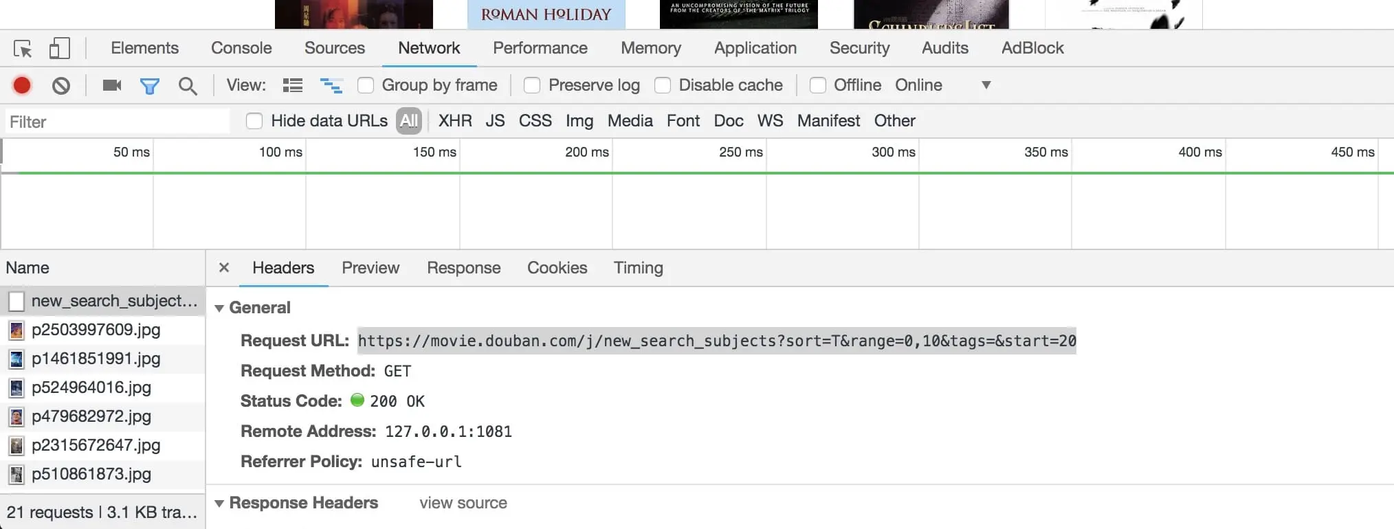 此外,通过利用Chrome的调试工具,在豆瓣电影-分类这个页面我发现了他们使用的一个JQuery接口,也是一个GET请求,不需要AUTH。