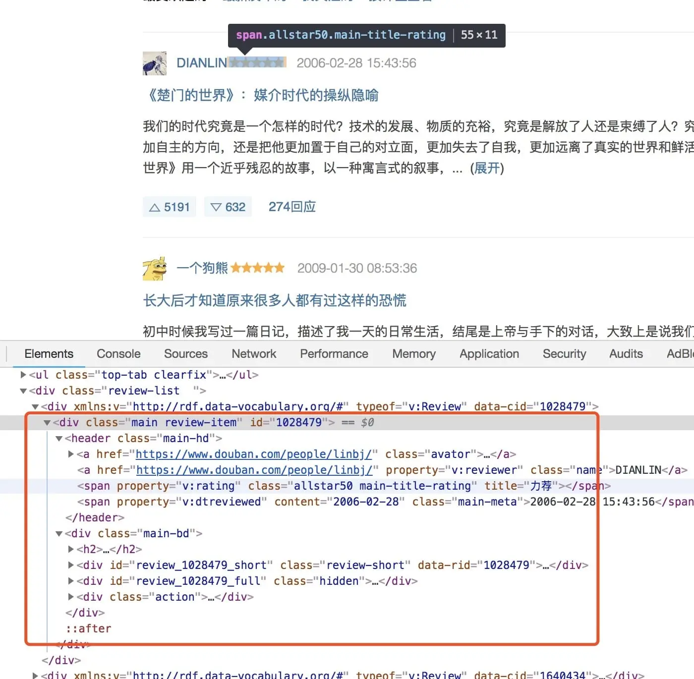 照例先用调试工具看看有没有可以用的api接口后,发现这次并没有那么好运了,这个影评页面是由服务器渲染完成的。