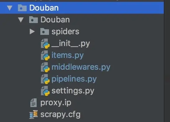 spiders: 爬虫文件夹,存放具体的爬虫代码,我们待会要编写的两个爬虫(电影信息和影评信息)就需要放在这个文件夹下