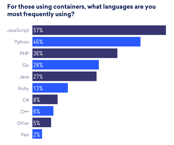 开发者使用容器搭配的程序语言,按照使用排名依序是JavaScript(57%)、Python(46%)、PHP(36%)、Go(28%)、Java(27%)等。