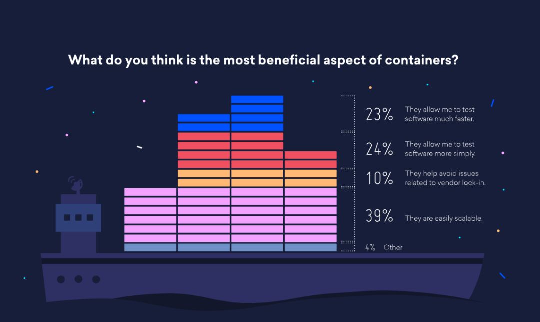 有39%的开发者认为,容器技术的高度扩充性是此技术带来最大的效益。而第二个受到使用者青睐的特质,就是让软件开发变得更简单(24%)。