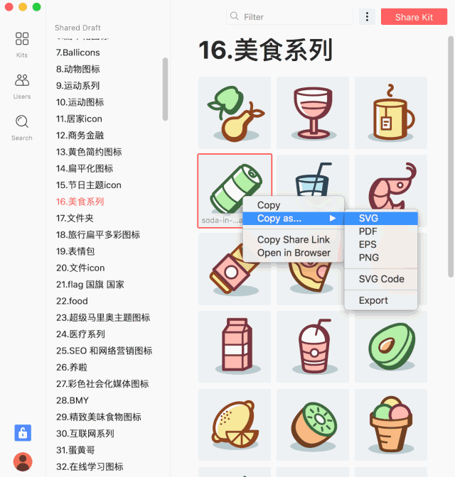 在 Lingo 上可以创建不同的专辑,上传 SVG 图标文件。在设计时,在 Lingo 上复制该图标,即可直接粘贴到 Sketch 画板里。