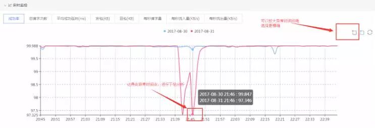 第一步:发现指标趋势图中成功率掉了一个坑,点击对应时间点进入下钻分析;