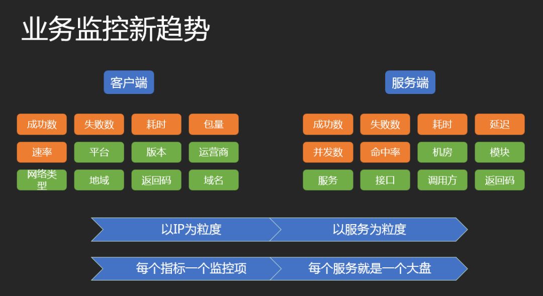 其实我们梳理一下常见的业务场景,客户端、服务端的维度、指标无非就是如下几种,如果在传统单维监控中配置,就需要每个维度值相乘的告警项数量,而在织云多维监控中就只是一份数据。利用织云多维监控的能力,就可以把监控粒度从IP放大到一个微服务,从每个指标一个监控项变成每个微服务一个大盘。