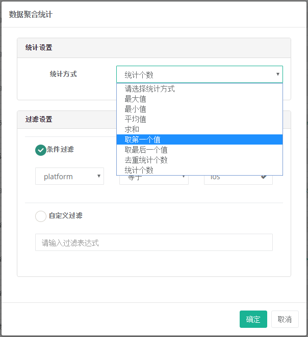 • 聚合统计(支持聚合时过滤):1、统计个数(PV)、去重统计个数(UV);2、最大值、最小值;3、第一个值、最后一个值;4、求和、求平均。