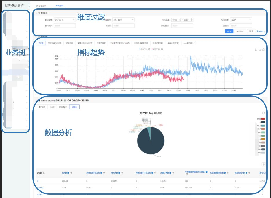 这个页面主要分为四块:业务树导航、维度过滤条件、指标趋势图、数据分析板块。其中维度还可以再次进行筛选、翻译等操作,指标可以进行更复杂的复合运算和格式化等操作。