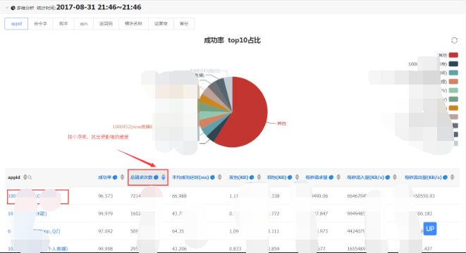 第二步:根据请求数排序,找到请求数高且成功率低的AppID,这样就确定了出现异常的AppID,点击进入第二个维度的下钻分析;