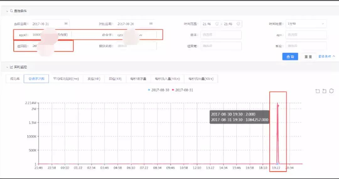第三步:继续找出有异常的命令字和返回码两个维度,这样就确定了该业务在AppID为a、命令字为b、返回码为c的情况下,出现了请求量暴增,最终导致成功率下跌。