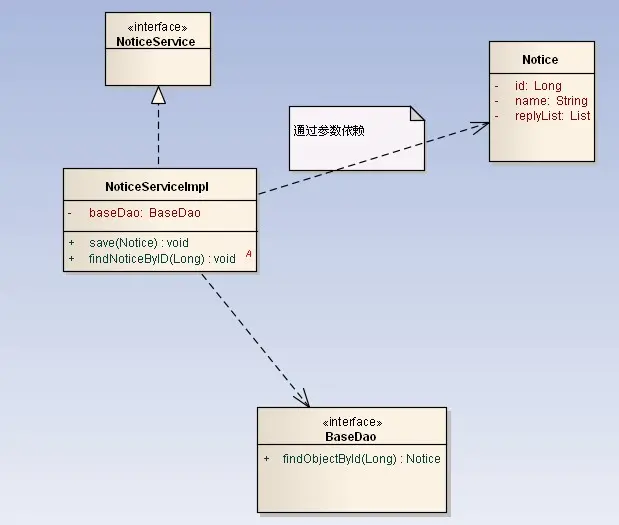 3. NoticeServiceImpl通过save方法的参数引用Notice,是依赖关系。同时调用了BaseDao完成功能,也是依赖关系。
