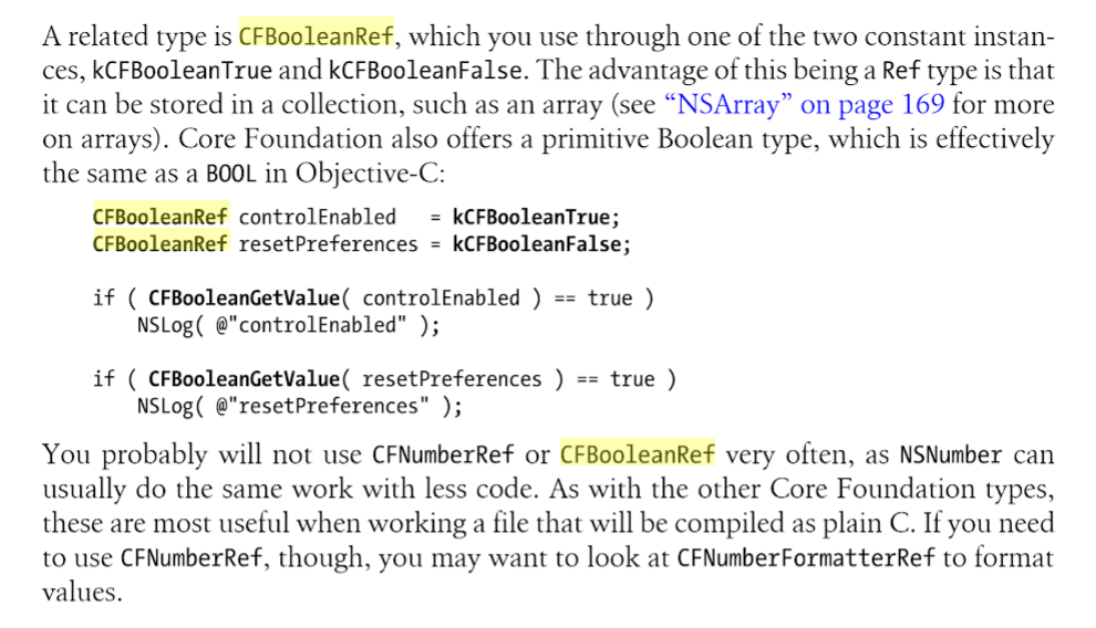 NSCFBoolean是NSNumber类簇中的一个私有的类。它是通往CFBooleanRef类型的桥梁,它被用来给Core Foundation的属性列表和集合封装布尔数值。CFBoolean定义了常量kCFBooleanTrue和kCFBooleanFalse。因为CFNumberRef和CFBooleanRef在Core Foundation中是不同类型,所以在NSNumber被以不同的衔接类表示是有道理的。 在《Cocoa and Objective C: Up and Running》中有如下内容: