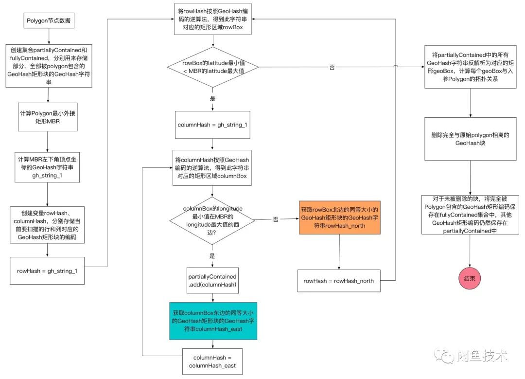 算法思路是,先找到目标Polygon的最小外接矩形MBR,计算此MBR西南角坐标对应的GeoHash编码。然后用GeoHash编码的逆算法,反解出此编码对应的矩形GeoHash块。以此GeoHash块为起点,循环往东、往北找相邻的同等大小的GeoHash块,直到找到的GeoHash块完全超出MBR的范围才停止。如此找到的多个GeoHash块,边缘上的部分可能与目标Polygon完全不相交,这部分块需要通过计算剔除掉,如此一来可以减少后续不必要的计算量。