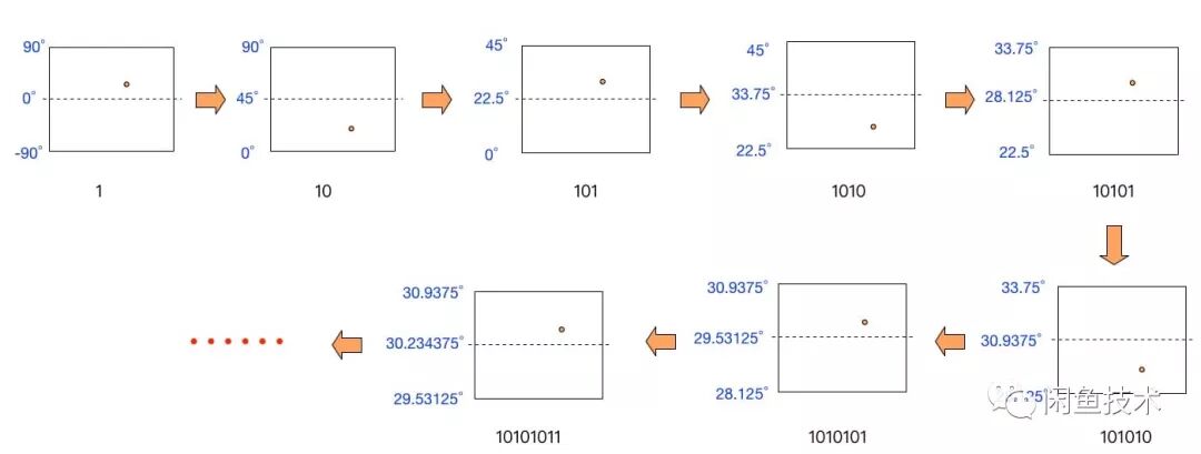以坐标“30.280245, 120.027162”为例,计算其GeoHash字符串。 首先对纬度做二进制编码: 1)将[-90,90]平分为2部分,“30.280245”落在右区间(0,90],则第一位取1。 2)将(0,90]平分为2部分,“30.280245”落在左区间(0,45],则第二位取0。 3)不断重复以上步骤,得到的目标区间会越来越小,区间的两个端点也越来越逼近“30.280245”。 下图的流程详细地描述了前几次迭代的过程: