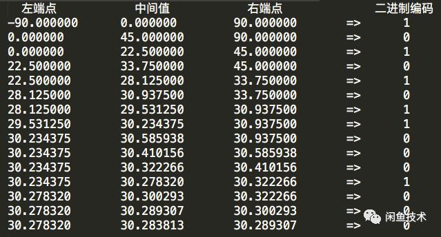 按照上面的流程,继续往下迭代,直到编码位数达到我们业务对精度的需求为止。完整的15位二进制编码迭代表格如下: 得到的纬度二进制编码为10101 01100 01000。