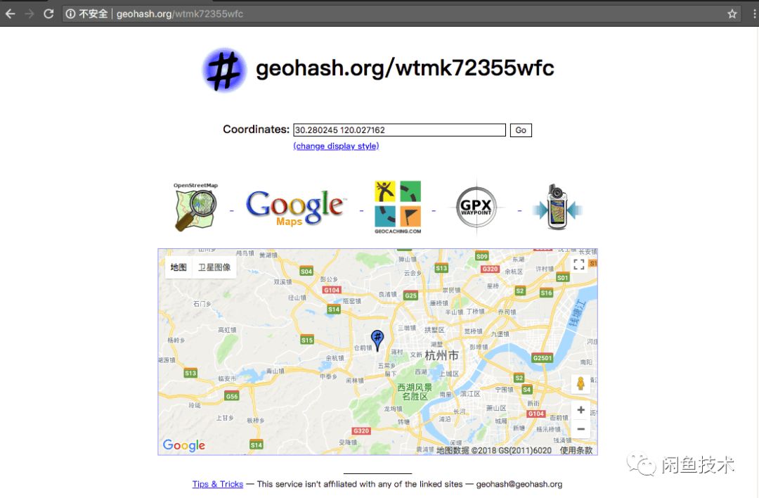 可以在geohash.org/网站对上述结果进行验证,验证结果如下: 验证结果的前几位与我们的计算结果一致。如果我们利用二分法获取二进制编码时迭代更多次,就会得到验证网站中这样的位数更多的更精确结果。