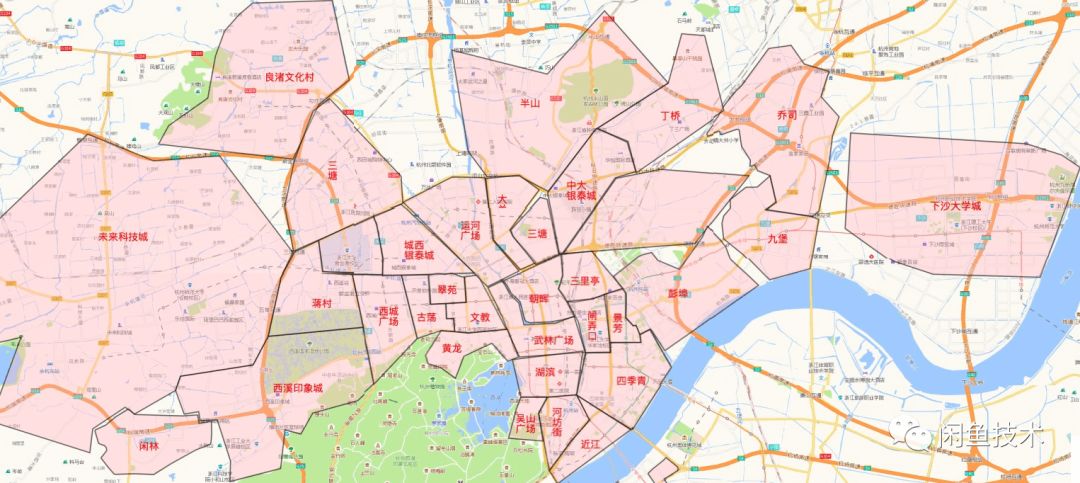 闲鱼app根据交通条件、商场分布情况、住宅区分布情况综合考虑,将城市划分为一个个商圈。杭州部分区域商圈划分如下图所示。