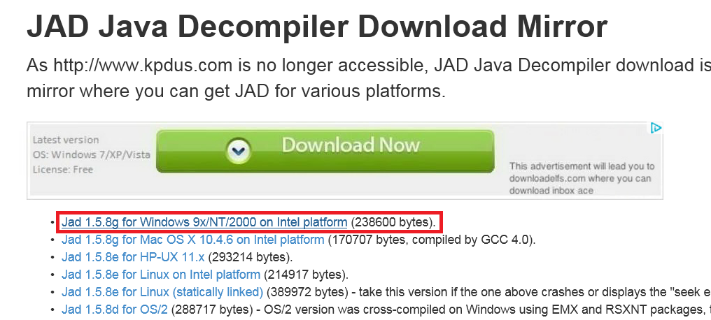 2. 根据操作系统的类型下载反编译器的执行文件。在我的windows系统上我下载的是JAD.exe。