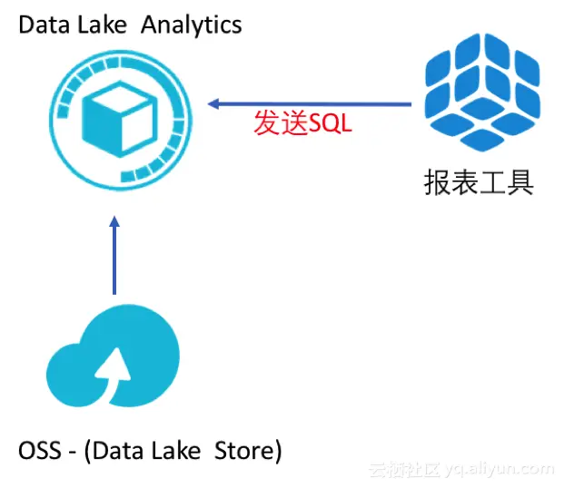 客户端通过报表工具生成各种提取数据的SQL,报表工具将SQL发送至Data Lake Analytics, Data Lake Analytics则直接去分析OSS数据,然后将分析后的结果返回给报表工具。OSS的10TB的存储每月费用在1200元左右,Data Lake Analytics则是完全按照查询使用量来付费(目前处于公测免费阶段),从而实现了一个完全自助化、极其廉价的可持续扩展的数据提取平台。