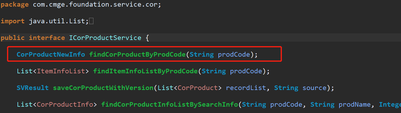 2、findCorProductByProdCode是在package com.cmge.foundation.service.cor;中定义的接口: