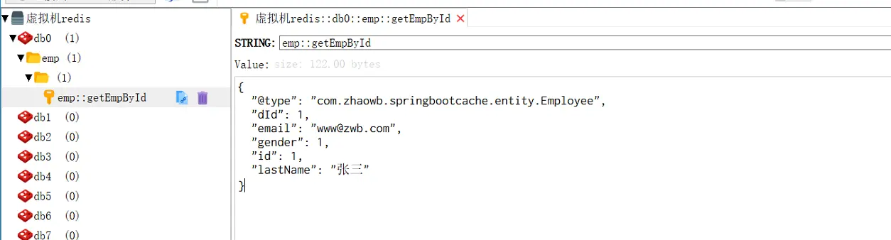 然后在测试类上加上缓存的注解就可以在redis中查看已经序列化成json格式的数据。