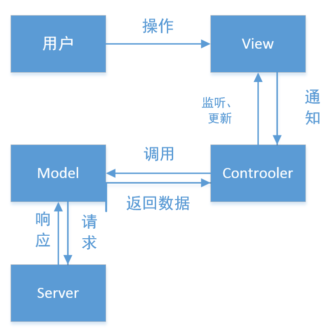 用户直接接触的是View,用户操作View时,Controller会接受到用户的操作行为,并对其做出反应。此时Controller会调用Model,Model会根据Controller的指令与服务端发生数据交换,然后将结果返回给Controller,然后由Controller去更新View,View将用户操作的结果呈现给用户。