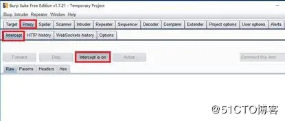 关闭浏览器其他的标签页,避免干扰。启动Burp Suite,打开Proxy标签页的Intercept项,将项目按钮调整成Intercept is on,如图3-21所示。