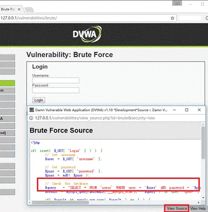 单击页面左侧的BruteForce按钮,进入暴力破解测试页面,单击View Source按钮,如图3-19所示。