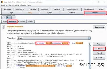 这里所有标示出来的参数都是可以用于暴力破解的。实际上只需要暴力破解username和password这两个参数就可以。单击Clear按钮,将这两个攻击目标的参数标示起来,如图2-25所示。
