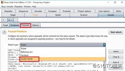 再来看看Intruder项目的攻击模式Attack type。Intruder的攻击模式有4种。分别为Sniper、Battering ram、pitchfork、Cluster Bomb模式。