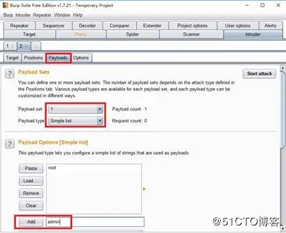 单击Payloads标签,为目标设置字典。第一个目标参数是username,用户名一般就是[root, admin, administrator],将这几个用户名输入到第一个目标参数的密码字典中去,如图3-27所示。