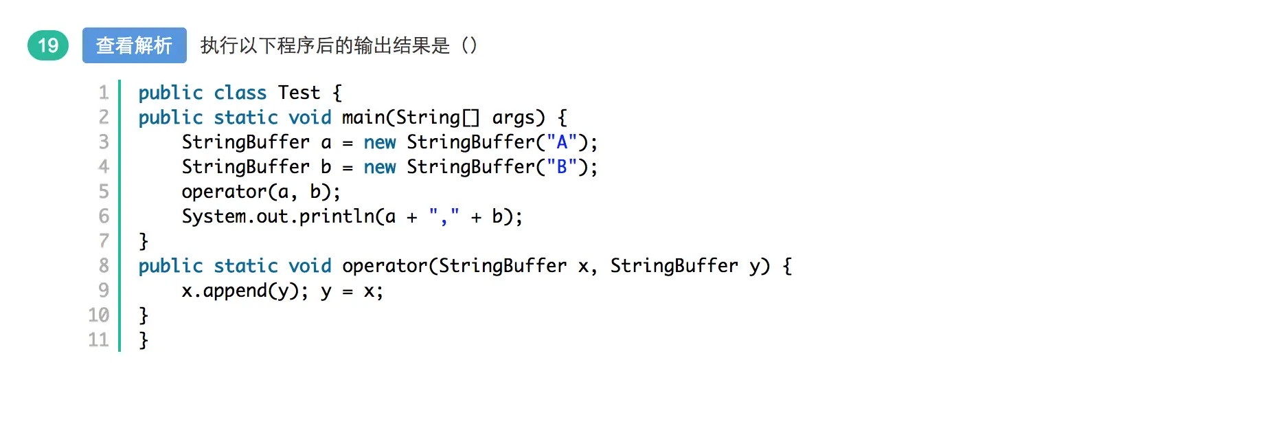 y = x; 是将原本指向StringBuffer("B")对象的钥匙,有指向了别的对象(x,即StringBuffer("B"),而调用函数中的StringBuffer b ,仍然指向StringBuffer("B"),没有改变,所以在调用函数中,println(b),仍然是"B",而StringBuffer a 所指向的对象,已经被改变了,变成了"AB" StringBuffer a = new StringBuffer("A");