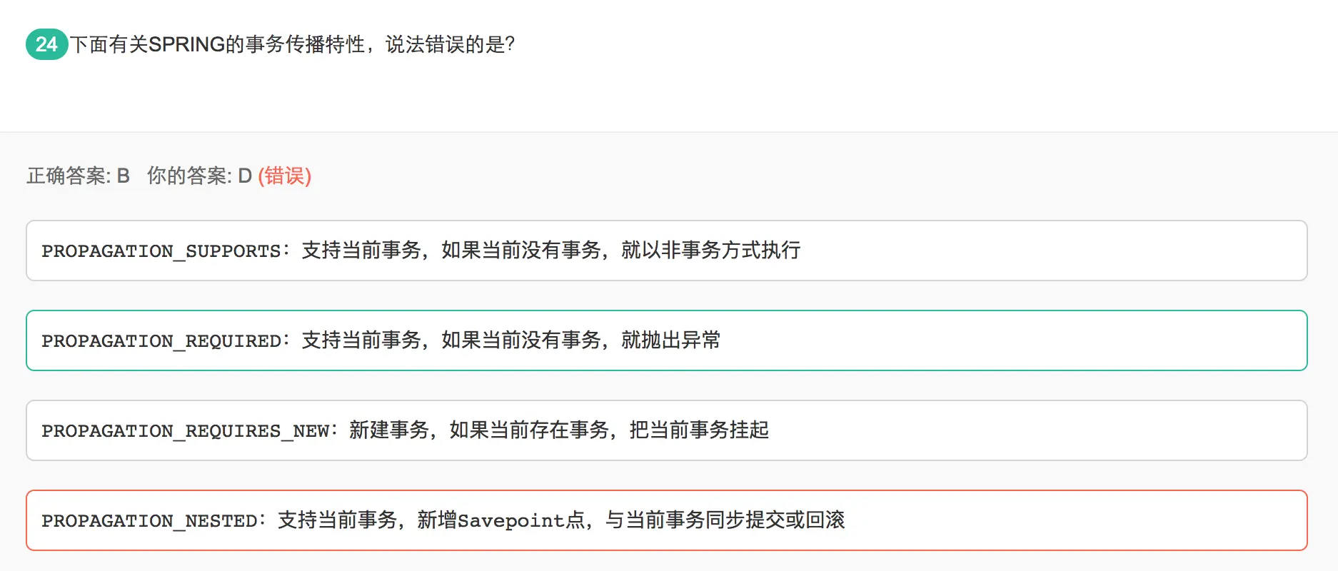 PROPAGATION_MANDATORY: 表示方法强制运行在事务中,如果存在不存在当前事务,就抛出异常,PROPAGATION_REQUIRED方法也是必须运行在事务中,但是不会抛出异常,而是新建一个事务