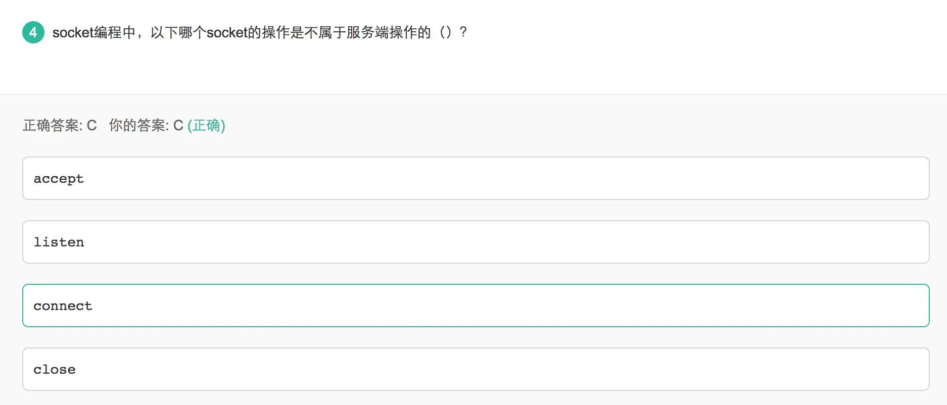 服务器初始化socket,然后与端口进行绑定(bind),然后进行监听,表示愿意接受连接,然后执行阻塞方法accept()知道接收到connect()请求,然后进行read()和write(),然后close