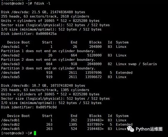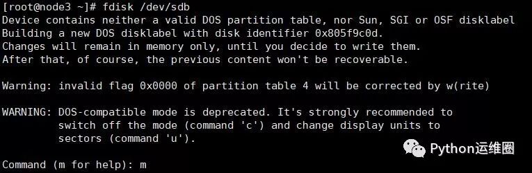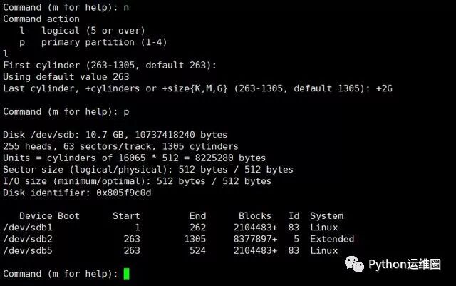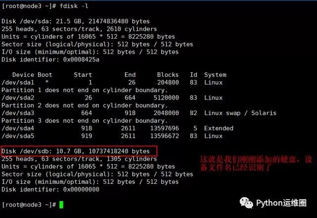 我们已经添加了硬盘,并且硬盘已经被系统识别了,现在就对其进行分区。执行下面命令