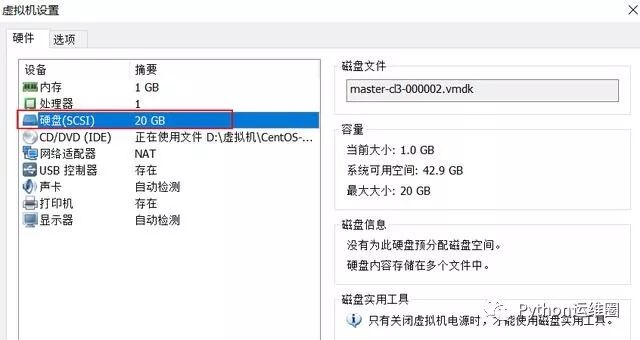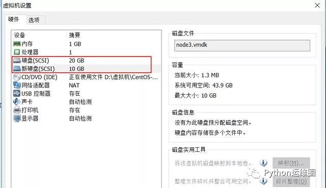 我们在虚拟机上进行添加,注意要先关闭虚拟机。在进行虚拟机安装的时候,我们给 Linux 系统分配了一块20GB的硬盘,现在添加一块 10GB的。