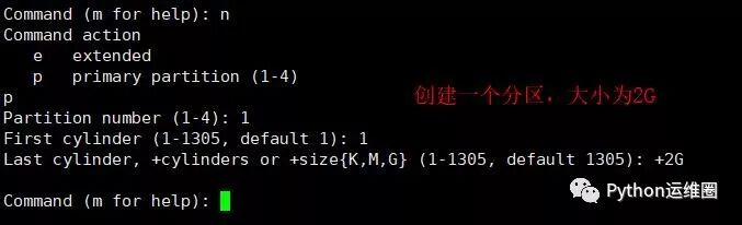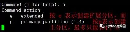第三步:主分区创建完成,这里我们在演示创建扩展分区,按e创建扩展分区