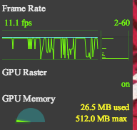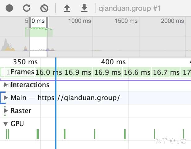 绿色的直方图即代表在页面重新绘制时的帧率,Frames 为每一帧渲染所花的时间。